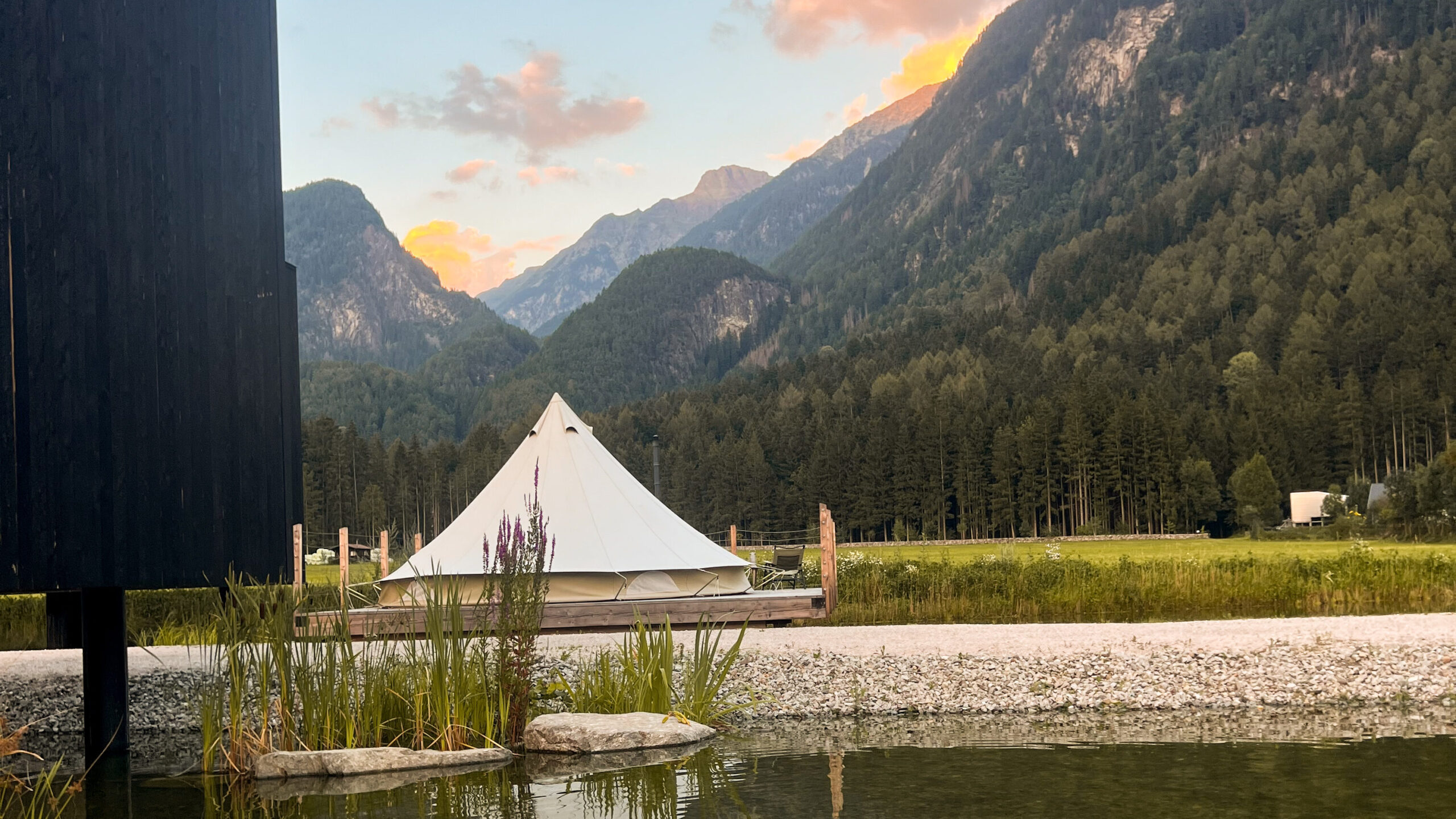 Je rijdt door kronkelende bergwegen, langs bossen vol sparren en lariksen, tot je ineens een kleine oase ziet: Sandgold Alpine Glamping. Hier geen overvolle kampeervelden, maar ruime plekken rond een natuurlijke vijver, met overal uitzicht op indrukwekkende bergtoppen.